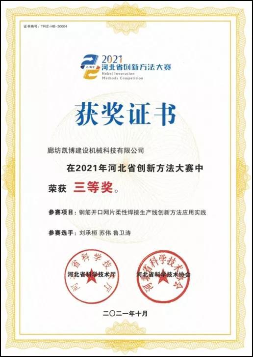 廊坊凱博建設(shè)機(jī)械科技有限公司(以下簡(jiǎn)稱(chēng)“凱博科技”)完成的“鋼筋開(kāi)口網(wǎng)片柔性焊接生產(chǎn)線創(chuàng)新方法應(yīng)用實(shí)踐”項(xiàng)目在2021年河北省創(chuàng)新方法大賽中榮獲三等獎(jiǎng)。此次參賽是凱博科技創(chuàng)新團(tuán)隊(duì)第二次參加河北省創(chuàng)新方法大賽,2019年凱博科技“教學(xué)型塔式起重機(jī)”項(xiàng)目曾獲“2019河北省創(chuàng)新方法大賽三等獎(jiǎng)”。